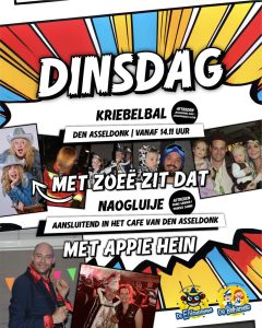 Dinsdagmiddag gaan we ouderwets kriebelen met het Kriebelbal. Dit start om 14.11u. Aansluitend gaan we nog Naogluije in het café van Den Asseldonk, treedt Appie Hein nog op en zullen Prins Sander I en Prinses Sanne aftreden.