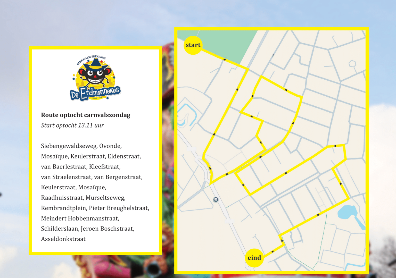 De zondagoptocht van CV de Erdmennekes vindt dit jaar plaats op 15 februari 2026. De start van de optocht vindt plaats op de Siebengewaldseweg. Vanaf daar loopt de optocht door de straten van Nieuw Bergen richting het eindpunt bij Den Asseldonk.